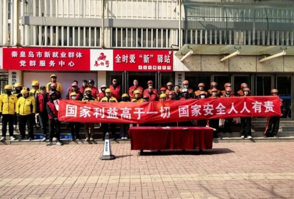 4月15日,在第十一个全民国家安全教育日来临之际,秦皇岛市个体私营企业(外卖配送行业)党委在市新就业群体党群服务中心、“秦快哥”全时爱新驿站同步开展“贯彻总体国家安全观‘秦快哥’在行动”主题宣传教育活动。
