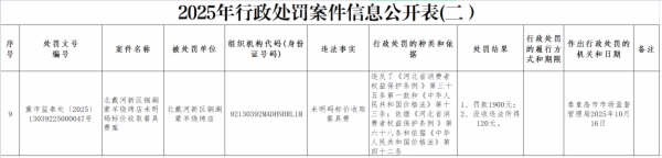 北戴河新区铜涮蒙羊烧烤店未明码标价收取餐具费行政处罚决定书