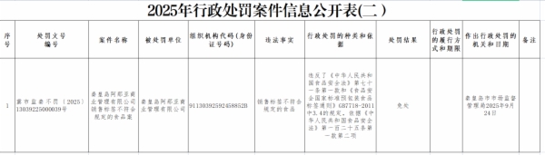 秦皇岛阿那亚商业管理有限公司销售标签不符合规定的食品不予行政处罚决定书