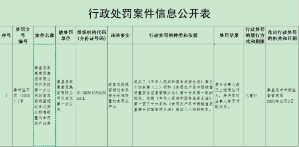 秦皇岛家惠商贸集团有限公司开发区第一分公司经营农药残留超过食品安全标准限量的食用农产品案