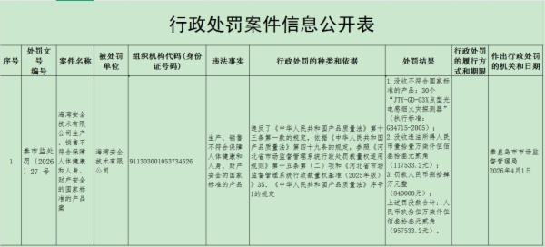 海湾安全技术有限公司生产、销售不符合保障人体健康和人身、财产安全的国家标准的产品案