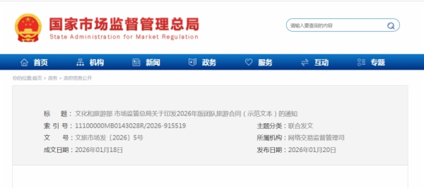 现将2026年版团队旅游合同(示范文本)印发给你们,请各地文化和旅游行政部门做好示范文本推行工作,会同市场监管部门引导规范旅行社合同行为,防范和纠正不公平格式条款,引导企业良性竞争,进一步优化旅游市场消费环境。本合同文本作为推荐性示范合同文本向社会公开,可登录文化和旅游部政府门户网站(https://www.mct.gov.cn)或市场监管总局政府门户网站(https://www.samr.gov.cn)自行下载。在推行、使用中若发现问题,要认真研究解决,并及时报告。